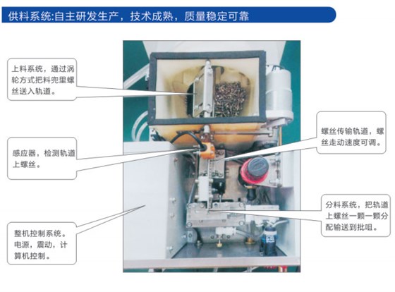 1、供料器:吹氣式送料機構將螺絲排序并通過推進系統(tǒng)把螺絲導入管道,